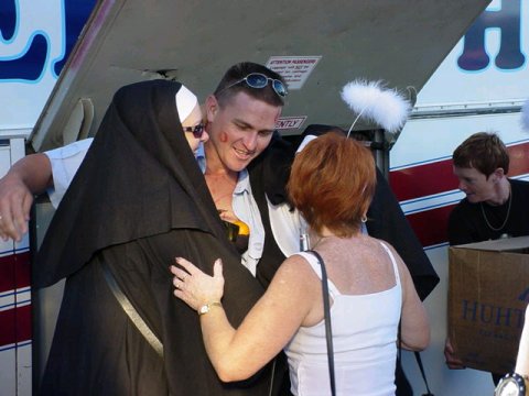 I think the bus driver is in urgent need of help after being seriously "done over" by the good Nun and her helpers!