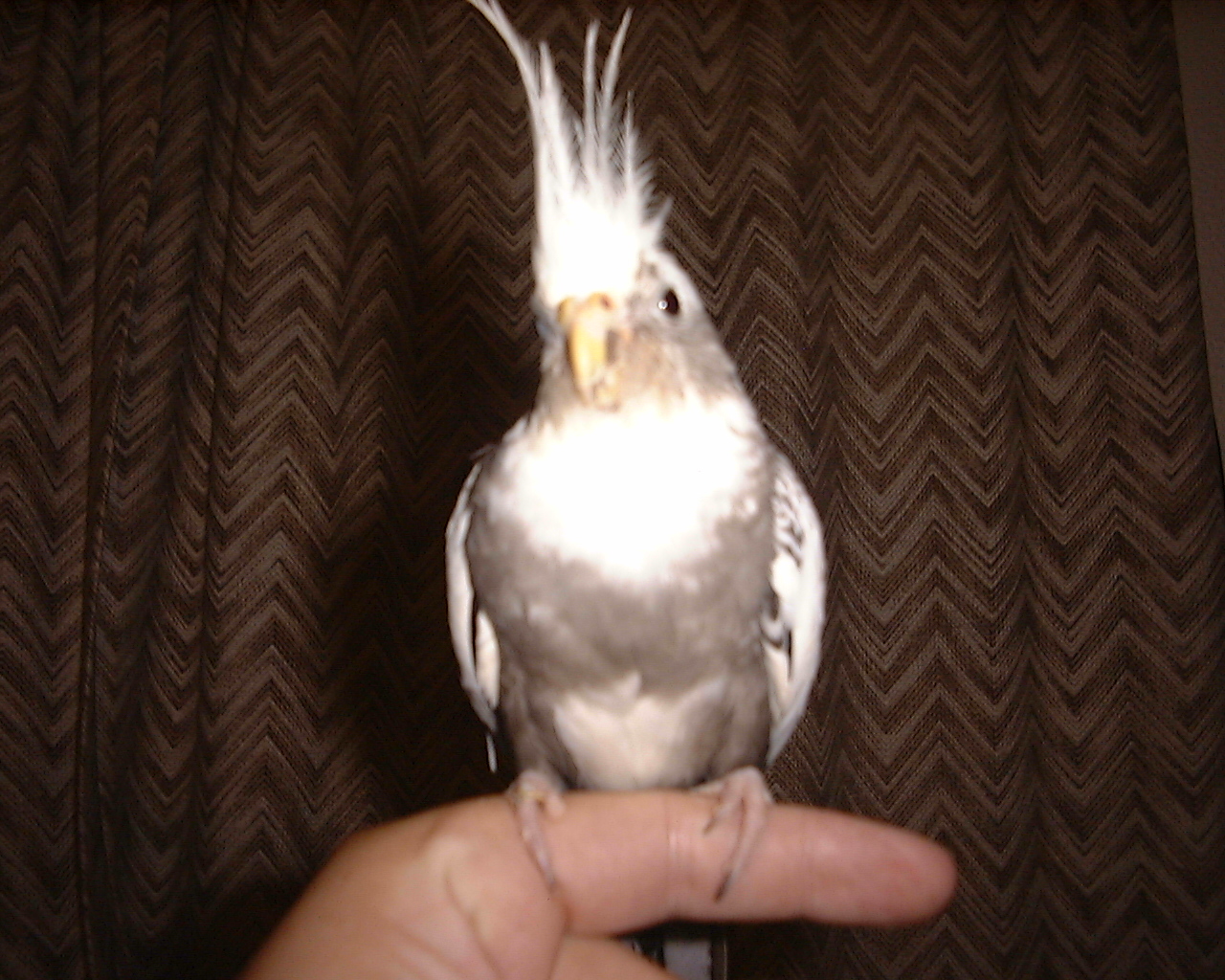 Dickie is my oldest cockatiel, she's a whiteface, and is five this year, she was a present from my grandparents. Her favorite foods are Frosties, and Cheerios :) She's a moody cow, and a pain in the backside, but that's why we love her! She's a daddy's girl, when she's with him, we're not allowed to touch her. Well, sometimes I am, because I handle her more than the others. She gets very jealous, she'll chase the other 'tiels away if I'm playing with them, lol. Here she is, on my Dad's finger, this was taken about a year ago, for my Welsh Coursework :) Apologies for the size of the picture, it may take a while to load.