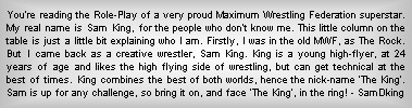 Sam King: I'm always scared before I wrestle, Ian. There's always an element of risk involved everytime I go out there, but, this Sunday there's gonna be more risk involved in that match that all my other matches put together. This match is for the Xtreme title, and y'know what that means. You saw what I did to them rookies last week, just so I could be Xtreme, and I'm gonna have to times that offence by one million if I'm gonna beat Cid this Sunday. He's a strong competiter.
