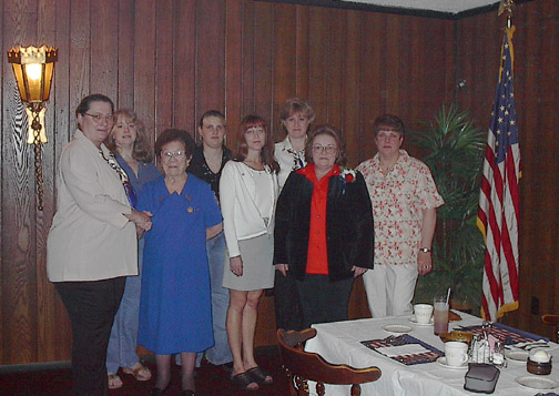 Installation of Officers 2002-2003 (Below, Left to right)MaryAnn Turner (President), Bethany Bachert (Sr. Vice President and Treasurer), Elsie Rita (Past Dist. 12 President/Installing Officer, JoAnne Turner (Trustee and Patriotic Instructor), Paula Blasko (Jr. Vice President and Historian), Donna Bynon (Conductress and Guard),Sandra Simmons (Secretary), Janet Kupec (Chaplain and Trustee). Missing from photo Catherine Hutta (Trustee).