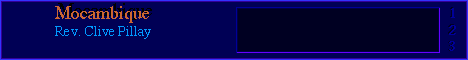Evening ecumenical services once held every forth-night, is now held weekly as organised by Rev. Peter Clark of the Weslyan Methodist Church and Rev. Clive Pillay. Sunday 23 January 2000 saw a Covenant service for all Methodists in Maputo with Rev. Pillay once again representing the African Methopdist Episcopal Church. Sis Sarah Zandemala proves to be quite an invaluable asset to the church here in Mocambique. She is presently helping Rev. Pillay in getting around to the various charges. She also repesnted the African Methodist Epicsopal Church at the Methodist Covenant Service.