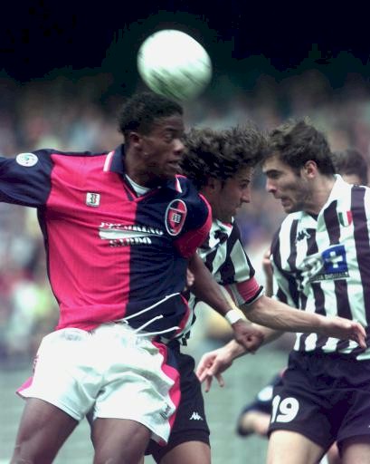 Del Piero(center) jumping for a header during the Juventus-Cagliari match