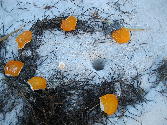 ORANGE PEELS NEAR THEIR SAND HOLES