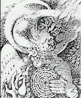 ________________________________ FOOTNOTES:*Von Daniken has suggested that the image of the creature pictured above was taken from that cave drawing. UFORC has tracked down this rendering of an ancient astronaut to a work entitled SPUTNIK. From there, the trail gets cold. We saw it pictured in an issue of FLYING SAUCERS magazine published in April of 1967 and we are still unable to verify its mysterious origins.