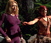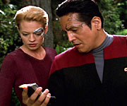 Natural Law *Synopsis: May 2, 2001 On their way to an intergalactic conference, Seven and Chakotay are deterred by an intense force field surrounding a planet. Blasting through to the surface, they find they're without communication to Voyager, with the delta flyer in shreds and isolated in the middle of a primitive society of hunter-gatherers. Webmistress's thoughts: Interesting story line, obviously refering to Native Americans. Chakotay is a Native American and could understand why it was necessary to protect their way of life. Seven's dilema over whether to protect their way of life or bring them into the 24th century is a typical problem many people face today about Earth's Native Americans. Was it just me or did anyone else notice that none of the natives talked? They had hand signals that they used, but was that their primary source of communication? Chakotay realized the value of the Prime Directive when the natives began painting tattoos on their foreheads like he has. That's when he realized the society had to be left alone. Your Thoughts Give me your thoughts! |