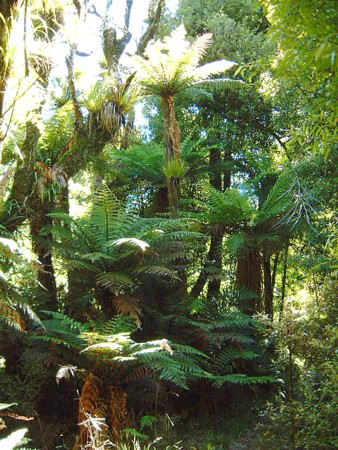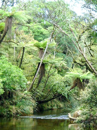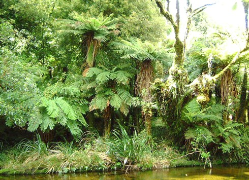 Cyathea smithii trunks leaning across a stream. Photo courtesy of Peter Richardson.