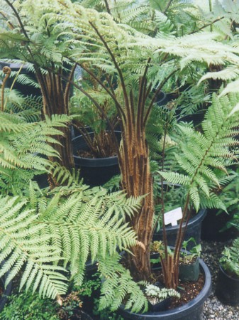 Dicksonia squarrosa at Fancy Fronds Nursery in Gold Bar, Washington. Although this specimen is reasonably healthy, the size of its fronds is drastically reduced from prolonged pot culture. Note also the sucker coming up at the base of the parent plant.