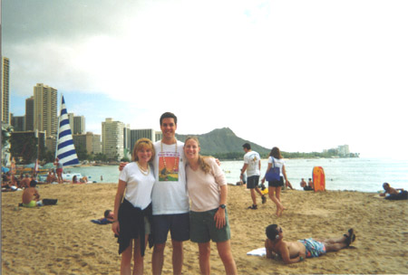 Laura, Jennifer, and Jeff on the beach in Waikiki.