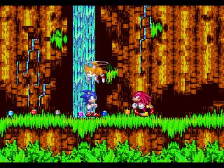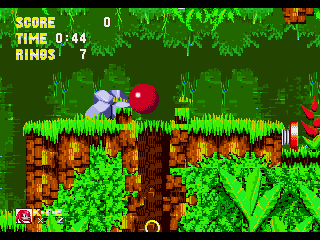 Angel Island is just like a tropical island only that it was! Now, it has been 'contaminated' by Robotnik. Observe the badnik, Coconuts, clinging on the tree. This guy 'fires' coconuts. He isn't vey powerful actually. There are also other badniks like a rhinoceros, a spike ball shooting flower and of course, a blue coloured flying caterpillar. Also, Knuckles' stage is different from both Sonic, Tails or Sonic and Tails together.