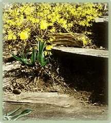The stairs are planted with bulbs and sedums. In the spring daffodils push between the steps, along with narcissus, they colour the garden yellow.