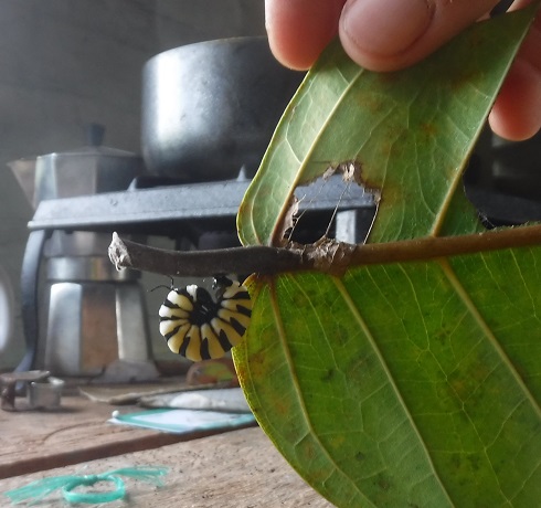 Fortunately, just on the other side of the road is a mature strangler-fig tree, possibly the parent of the seedling. Now I could supply them with as many leaves as they needed. Over the next days, I continued to find more of the same kind of caterpillars, these on the big strangler-fig. As I found each, I brought it into the lab, where it was out of reach of predators and parasitoids. However, I did not expect these caterpillars to have many predators. It is no accident the striking yellow-and-black banded pattern is similar to that of a bee or yellow jacket; it serves the same purpose of warning. In the monarch, the warning is that the caterpillar has the same bitter toxin as the milkweed plant it eats. In biology, this is termed aposematic coloration. The strangler-fig also exudes a milky white sap that looks a lot like that of the milkweed. By this time, my mind schooled in evolutionary biology was beginning to envision a scenario.