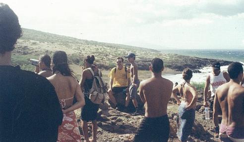 Well! If we're going to go to all the trouble of digging an imu, we might as well make it a festive atmosphere. After the food had disappeared and night was falling, several of the men brought out their guitars and began playing whatever songs they knew; likewise, several of the women, who were involved in the hula schools, began doing their hula. When the music died down, out came the kava root, squeezed in a wet cloth to extract the juice. The kava drink flowed freely, its mildly narcotic effect bringing on the reflective mood. I don't know if it was exactly a luau -- certainly not like the commercial luau productions of the hotels -- but certainly it was a local kine goodtime. I stayed near Maka, as the kava was loosening his tongue, and I wanted to hear more about the Hawaiian sovereignty movement. I had one question in particular: what place would there be for haole, that is, non-Hawaiians, in a sovereign Hawaii? Unfortunately, I never got an answer, because I chose my words poorly; instead, my ill-considered phrasing brought on a speech about the illegitimacy of the American occupation of a Hawaii that already has an inherent sovereignty. Still, it is hard to stay agitated long under the influence of kava, and so Maka's anger faded as suddenly as it had come on. The kava certainly had its intended effect on me; there was no sign of my insomnia that night, and I even slept later than usual in the morning.