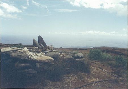 The highest peak on Kaho`olawe is Moa Ula. We spent one whole day in a hike to the summit, stopping along the way to see an ancient adze quarry, where flakes of obsidian still lay atop the now badly-eroded soil. On Moa Ula, large areas remain contaminated with UXO; along some stretches, the trail is marked by the line of orange stakes reading "WARNING: Limit of UXO clearance." You do not want to go off the beaten path here. In this area were expanses of completely barren ground, with patches of unusual colors -- shades of red, orange, yellow, green, blue, and purple. The Hawaiians maintain that these colors were caused by the bombardments, some kind of chemical in the bombs interacting with the soil. I do not know enough about it to have an opinion one way or the other; but I do know that the topsoil appeared thoroughly obliterated, and it would be a long time before any vegetation would again grow here.