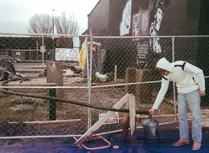 Unique, though, is the artesian well --pure artesian water in the heart of the city, free for the taking. Just bring your containers. Local legend says that one who drinks of this water will surely return to Olympia. It worked in my case; I keep trying to leave, but somehow, I keep ending up in Olympia again and again. The well has had a major makeover recently. Originally, in a parking lot much like any other, a steel pipe rose from the pavement, bent into an upside-down "L," from which water flows without ceasing (there being no shutoff valve). This picture was taken during the renovation; a hose allowed people still to collect water while the site was fenced off. Note, once again, the murals, depicting members of the community who used the well. Now that renovations are complete, the cement pillars are covered with colored tiles; but the murals were painted over, reduced to a plain black wall. Why? But the people made their statement: the plain black wall where the murals once were has now been tagged with grafitti -- an appropriate protest against the destruction of public art by the city.