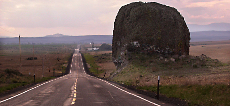 These pictures really jump around ... I'll build my official more organized Ice Age Flood Site later ... West of Grand Coulee dam the the plateau is dotted with many boulders deposited by the ice sheet. It's amazing to me that during the last ice age, this boulder was pushed south almost to ... but not onto the highway between Sims Corner and Mansfield.