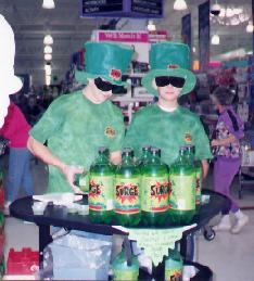 Stephen and Jason working serving the new drink surge at Wal Mart, they kept getting in trouble because they would give all of their friends a lot to drink and fill up their glasses with the surge.