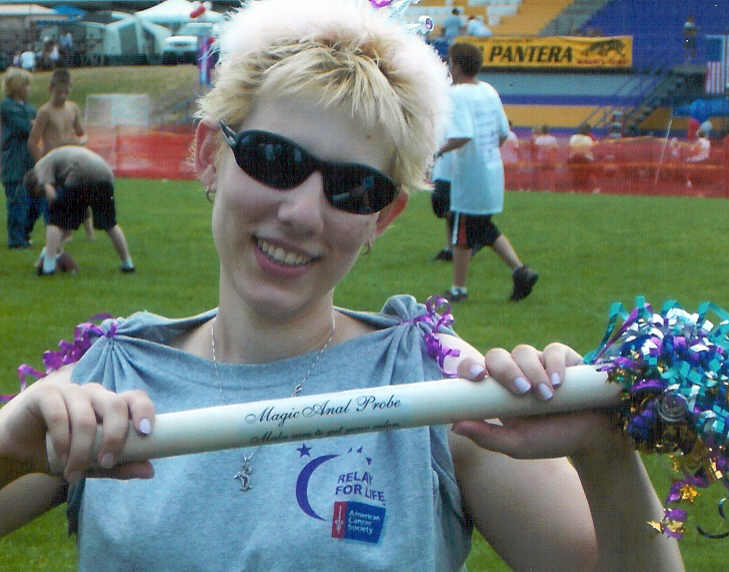 A new idea for relay this year was team batons. And yes, it does say "magic anal probe." My dear sweet sister came up with the name when I was holding the pipe before it was all dectorated, and she asks, "What the heck is that, an anal probe?" And the story was born..... go figure!