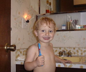 the toothbrush and pretend that I am brushing my teeth, my Dad trys to sneak up on me to catch me. It is important to spit out the toothpaste and rinse out your