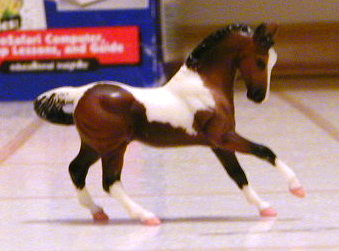 Breyer new mold Stablemate Warmblood stallion done by Caroline. Bay overo Pinto Warmblood w/ 4 socks and a blaze. Etched, but hooves and tri-eyes painted.