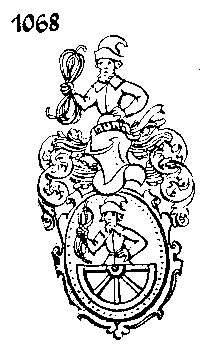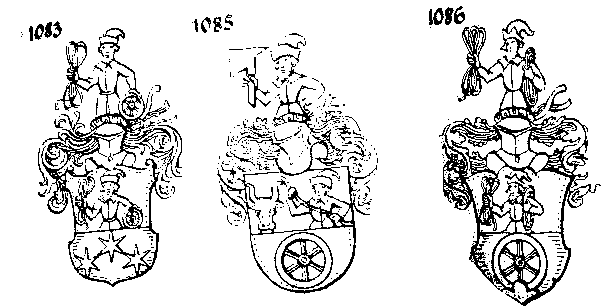 Wappen 689: Geviertet, mit einem roten Herzschild, darin ein aufrechter weißer Pfeil, schräg überkreuzt von einem solchen Spaten und einem Säbel; am 1. Platz weiß-rot geschacht, mit einem gelben Rad, am 2. Platz in Blau ein stehender, gezäumter und gesattelter Schimmel. Auf dem Schild zwei gekrönte Spangenhelme, jeder mit einem aufwärts wachsenden, gcharnischten Arm, die zusammen ein Spruchband mit der Devise: "Ehrlich wehret lang" halten. Dazwischen unmittelbar auf dem Schild eine Kugel mit einer Fortuna.