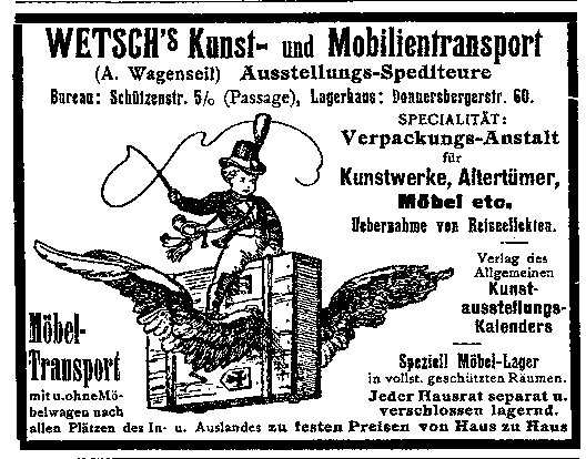 "Münchner Jahresausstellung Glaspalast 1902", Verlag der Münchner Künstlergenossenschaft, S. 15: Anzeige von Wetsch's Kunst- und Mobilientransport, Ausstellungs-Spediteure, Armin Wagenseil. Die Firma C.W. Wagenseil & Sohn wurde von Arthur weitergeführt (s. Gen. 10).Malwine Wagenseil, geb. Schäfer