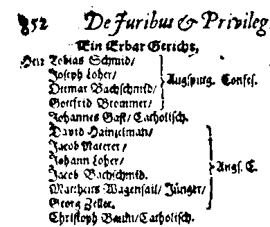 Hier zusätzlich unter der Überschrift "Ein Erbar Gericht" mit Klammer "Augs. C[onfession]": "David Hainzelman/ Jacob Naterer/ Johann Loher/ Jacob Bachschmid.[/] Mattheus Wagensail/ Jünger/ Georg Zeller" (Abb.).