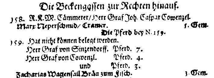Abb. Johann Friedrich Wieland: "Das Hoch-beehrte Augspurg, Oder Wahrgründliche Vorstellung, der Hochwichtigen Handlung und Verrichtungen, So Bey und Nach dem Hocherfreulichsten Einzug Beyder Röm. Kayserl. Majestäten, Wie auch der Königl. Majestät in Ungarn ... und darauf erfolgter Höchst-ansehlichster Prächtigster Krönung der Aller-durchlauchtigsten, Großmächtigsten Fürsten und Frauen, Frauen Eleonorae Theresiae ...: Nicht weniger bey der ... Römischen Königs-Wahl ... und Krönung ... Josephi ... In Augspurg denck- und Merckwürdiges von Tag zu Tag vorgegangen", Augsburg: Jacob Koppmayer 1690 = u.a. VD 17 14:017979D, S. 43: "Die Beckengasse zur Rechten hinauf [...] Zacharias Wagenseil Bräu zum Fisch" [ books.google.de ].
