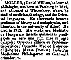 "Mollerin (Helena Sybilla [auch Sibilla, Sibylla]) ein gelehrtes Frauenzimmer. Sie erblickte im Jahr 1669 das Licht der Welt, und war eine tochter des berühmten Professors zu Alt[d]orf, D. J o h. C h r i s t o p h W a g e n s e i l, unter dessen Anweisung sie sowol die Lateinischen als Griechischen Scribenten verstehen gelernet, als auch zu einer ausserordentlichen Fertigkeit in der Hebräischen, Italiänischen, und Frantzösischen Sprache und besondern Einsicht in den Philosophischen und anderen Wissenschafften gelanget. Die Gelehrte sogenannte Societas recuperatorum zu Padua, hat sie dahero unter ihre Mitglieder aufgenommen. Im Jahr 1692 verheyrathete sie sich mit Herrn D a n i e l W i l h e l m M o l l e r n, Professor zu Alt[d]orf, mit welchem sie bis 1712 eine vergnügte, aber unfruchtbare Ehe geführet [sie war seine zweite Frau, die erste Ehe Mollers war ebenfalls kinderlos, vgl. S. 937ff.]. Nach dessen Tode lebete sie beständig als Wittwe, bis sie endlich den 29sten September 1735 im 66sten Jahre ihres Alters zu Alt[d]orf gestorben. In die Stamm-Bücher pflegete sie zu schreiben, [eigentlich in griechischen Lettern:] exp theós exdixon omma. Siehe Acta Hist. Eccl. Tom. VIII, p. 279, u. s. Rannst Geneal. Archiv. XXXVIII Theil p. 708 u. s."