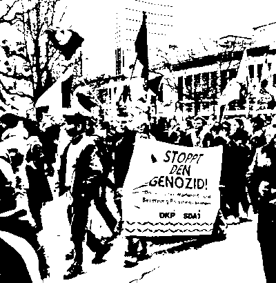 Abb. "Unterstützerdemo für Gaza, unter anderem durch Islamisten und unter Beteiligung von deutschen Linken. Hier sind es Vertreter der DKP und SDAJ, die auf dem Transparent die Propaganda vom vorgeblichen Genozid durch Israel verbreiten", 3. Februar 2024, Frankfurt am Main, Bild von Ostendfaxpost unter Creative-Commons-Lizenz CC BY 4.0 (Ausschnitt, modifiziert).