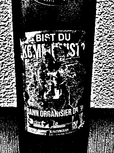 Abb. Fotografie "'Der Funke', später: 'Revolutionäre Kommunistische Partei', 'Bist du Kommunist?'", angerissener Aufkleber mit Konterfei von Karl Marx auf Laterne, wirbt nach dem 7. Oktober 2023 mit "Intif[***] bis zum Sieg". Intif[...] ist eine Ableitung des Verbs انَفَّضَ naffaḍa, das unter anderem "sich erheben", "abstreifen" oder "abschütteln" bedeutet, im historischen Resultat einen Aufruf, Juden*Jüdinnen zu ermorden. Während der sogenannten "zweiten Intif[***]" 2000-2005 schrieb Paul Spiegel, damals Präsident des Zentralrats der Juden in Deutschland, einen Gastbeitrag in "Die Welt", "Israel kämpft um seine Existenz", 02.04.2002: "Wie schon so oft, verschanzen sich hinter dem Ruf nach Frieden die wahren Mörder".