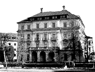 Abb. "Karolinenplatz 5, Prinz-Georg-Palais" von Rufus46 (2011) unter Creative-Commons-Lizenz CC BY-SA 3.0 (modifiziert). "Von Ende 1908 bis 1931 residierten Elsa und Hugo Bruckmann, Verleger von Houston Stewart Chamberlain, in der zweiten Etage des Palais, wo sie immer freitags ihren Salon Bruckmann abhielten, der zuvor bereits seit Januar 1899 in der Nymphenburger Straße 86 stattgefunden hatte" (WP, 2023).
