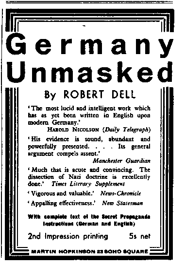 Abb. Advertisment for Robert Dell: "Germany Unmasked", London: Hopkinson 1934, "The New Statesman and Nation", Vol. 8, Issue 183, "August 25, 1934", p. 243.