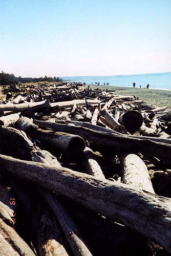 Looking down the beach at all the drift logs. |
