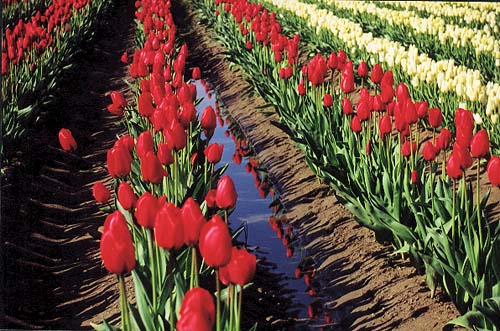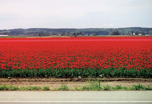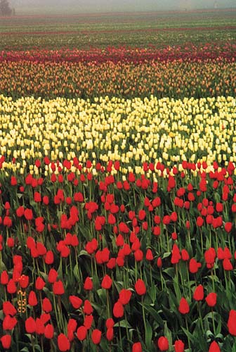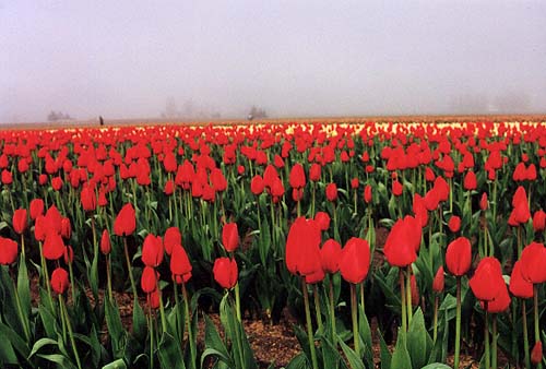 | In April they have a tulip festival in Skagit County when they are in full bloom. Simply breath-taking. Also planted to bloom the same time are daffodils and Irises. Close up Vivid colors right on the side of the road. Like a rainbow. A foggy morning in tulip land.