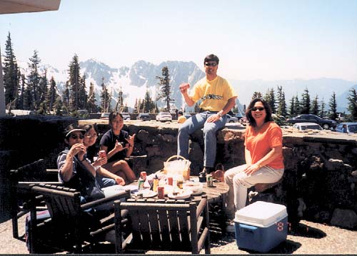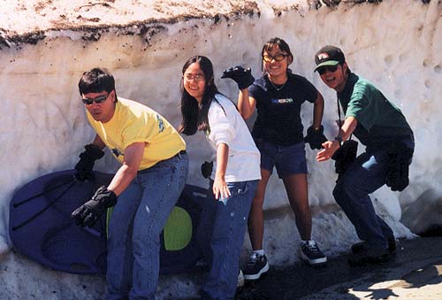Mt Rainier in the summer, to the Cascades in winter, you can always have snow fun in Washington! Snow surfing Nothing better than a picnic lunch after playing in the snow. Lauren & Brandi getting ready for a snowball fight. Real snowflakes on Lauren's glove. Check out the big one in the center, just like you imagined snowflakes would look like! Catching snowflakes. Good thing the birds are not around! That's Lauren shredding the mountain! You can tell her by her surfer stance. Al & Claire getting ready to slash! Ready to go after a lunch break in the lodge. Bernee loaded all of us up with musubi and fried chicken! So ono after a cold day outside!