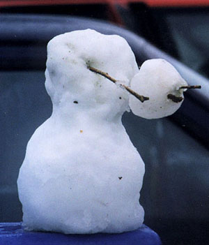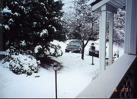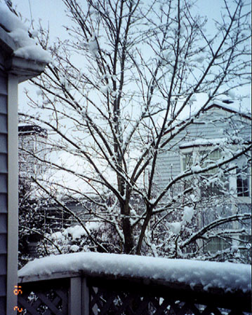 Claire's headless snowman - eek! Christmas eve 1998, our first snowman! Snow comes to Bellevue! Looking out our front door. This closed schools and some businesses 2/16/01. The tree outside our lanai. Notice the snow on the railing. |