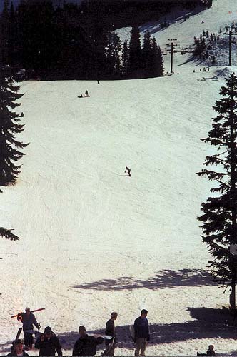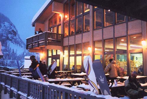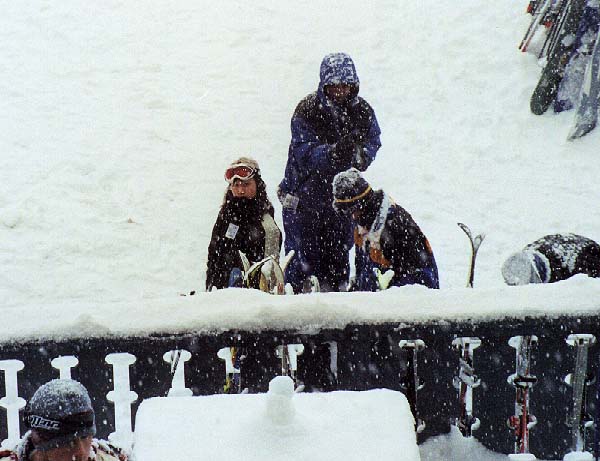 It's snowing! That's us getting our boards - Claire, Dan with the hood, and Al with his beanie cap. Notice the snow on us just after a few minutes outside! At the lodge. That's Al & Claire on the lanai, and upstairs is where Judy & Bernee watched while keeping warm and relaxing.
