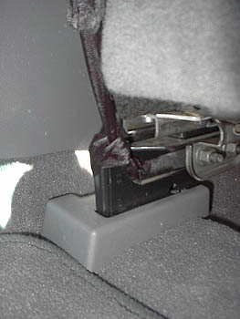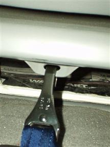 In this picture, the Roundabout is installed in a 1998 Ford Windstar. The tether is connected underneath the vehicle seat to the factory installed tether anchor. This is what it looks like from the back of the seat. This seat is tethered using the Swedish method. This method attaches the tether to the anchor behind or under the car seat. I also included a close up shot of what the tether looks like attached to the anchor under the seat. |