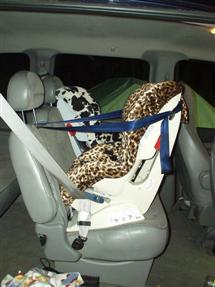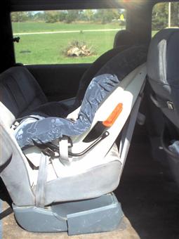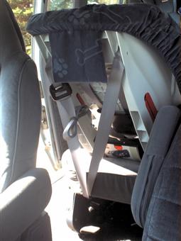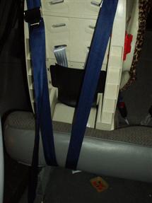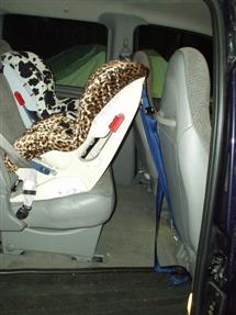 This is another shot of the Roundabout installed in a Ford Windstar using the Swedish method of tethering. The main difference between this picture and the above picture is how the seat in anchored. In this picture, the seat is anchored to the front passenger seat's factory installed, tether anchor. The other picture is a close up shot of the tether anchor and tether hook. |