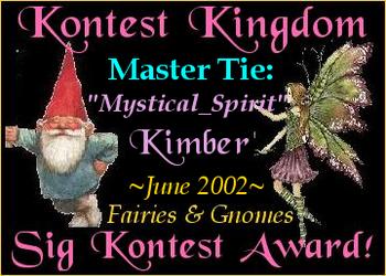 This award was presented to me by Pink and Pete at Kontest Kingdom's Fairies/Gnomes Sig Contest. Thanks again for this adorable award.