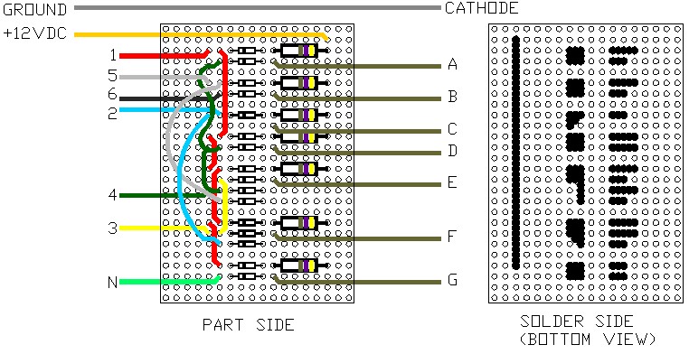 Now connect the long wires for each gear and Neutral. These are the wires that go off board to the left in the pictorial. In addition connect a wire to the common resistor bus on the non diode side of the resistors. This is your 12V line. You may want to mark the wires at this point so they don't get confused later. Mark them 1 - 6 , N, and 12V The two foot wire is your ground and will go directly from the gear plug to the display plug. Mark one end Gnd and the other CAT.