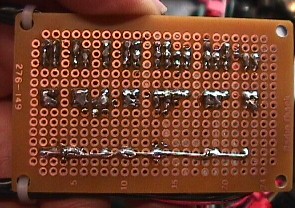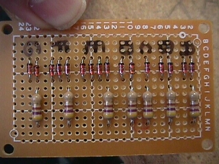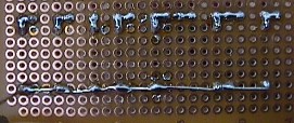 The construction technique I used to build the board is what I call 'solder bridging'. You take a perforated circuit board with solder pads on one side and solder the parts in place. In this case the resistors and diodes. To interconnect the different parts you place some solder between the soldered connections until it bridges across them making a connection. Normally solder bridges are undesirable objects caused by using too much solder but here we will take advantage of them. They are much easier to produce than an etched circuit board or connecting all the parts together with wire.