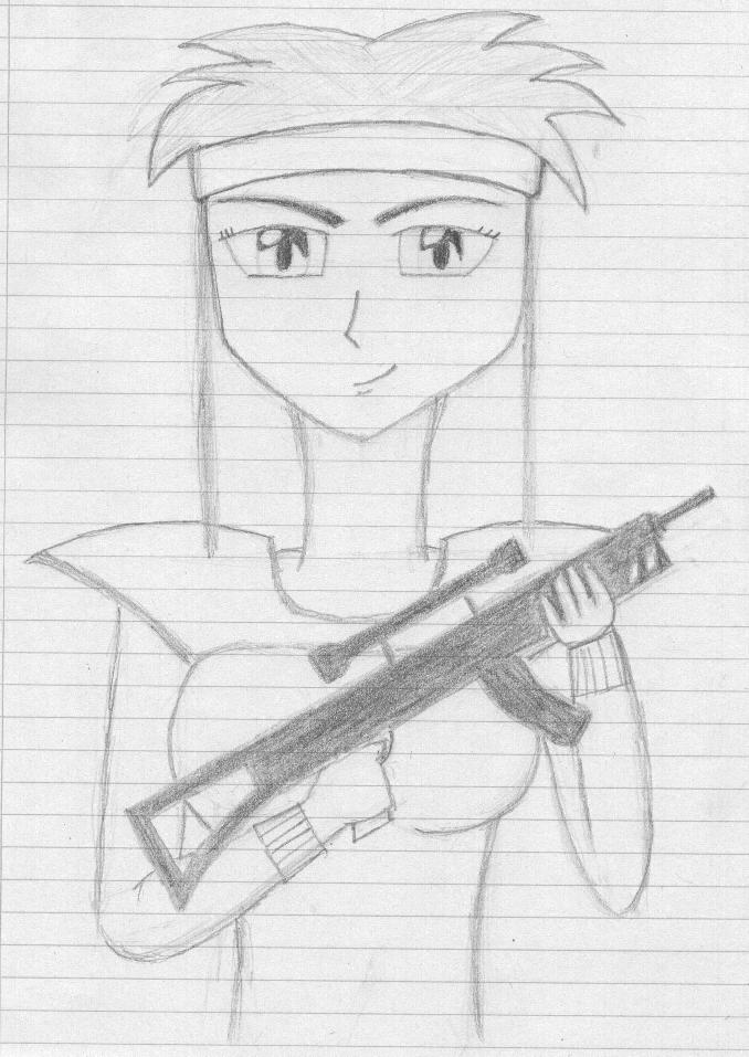 This is Jane with a MP13 (Look at the guns drawing to see what I mean). I made this one on school with the lined paper. There are some flaws and stuff in this drawing (The hands, for example), but I find she came out great.