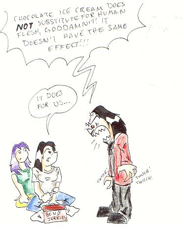Well, I couldn’t help but draw it I’m still rather miffed about my ex b/f spreading lies about me and trying to terrorize me using the internet, so I might as well give into fantasies... and yup, the black haired gal‘ is a cartoony self-portrait!