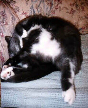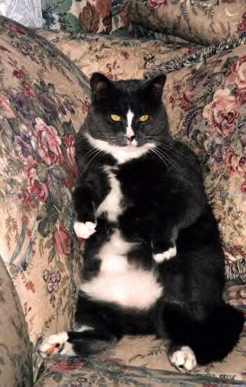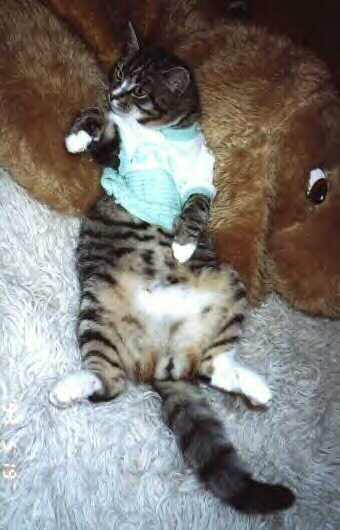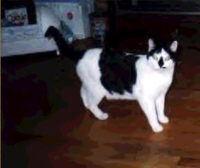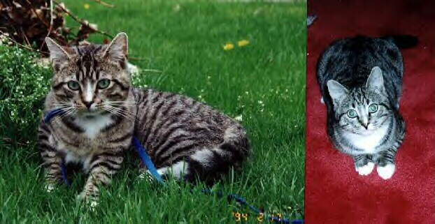 This is my beloved April.. In the right picture, he's on my bedroom floor just gazing at the camera. In the left one, he's outside (duh). By the way, I named my guy cat APRIL before I realized he was a male (give me a break, he was just a kitten, lol).. We got him on December 10th 1999, and found out about a month later that he has feline leukemia. But, a year later, he's still going strong.