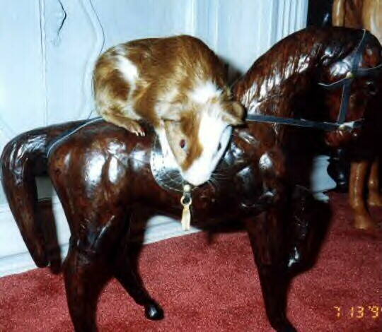 This is my guinea pig Spanky. (My friend Ryan is the one that named him.) Well, this is Spanky on his horse..