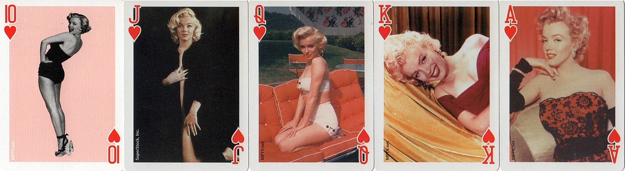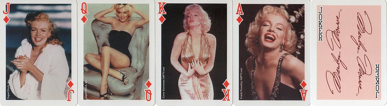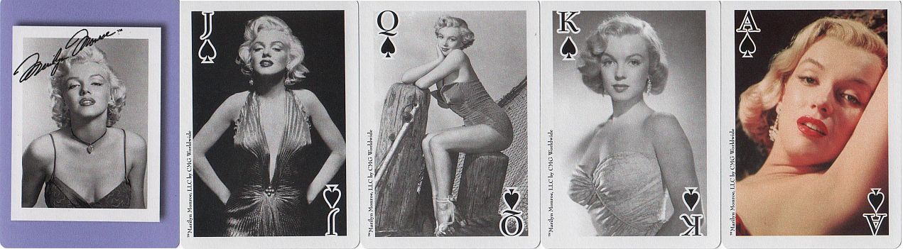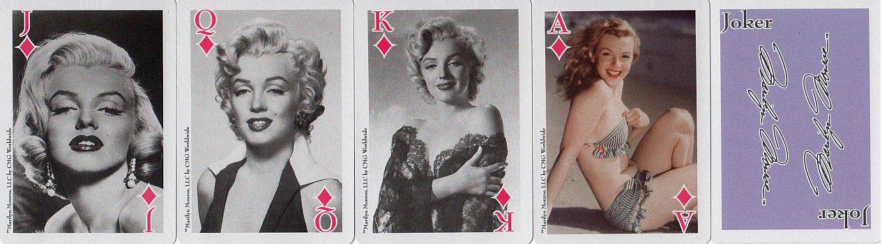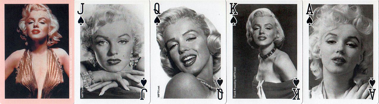 Here are two different decks of Marilyn Monroe playing cards. On the index page, I used a pic of the box the second deck is in, as the link to this page. (The pic on the box of the first deck is the same as the card backs from that deck.) It's kind of odd, I noticed the UPC codes for both decks is exactly the same, even though they're clearly different products. I mean, they each have completely different pictures. But they're both similar in that some of the pics are black & white and some are color, and that it's only the face cards that have different pics. (2-10 of every suit are all the same, though the pics used for those cards are different for each deck.)