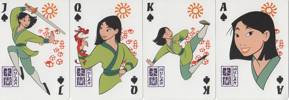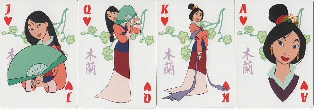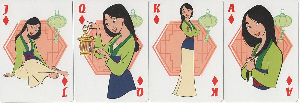 Playing cards based on the movie Mulan. I scanned the face cards, but the numeric cards I didn't bother with, because the pictures on them are just sketches of symbols or animals, mostly. They're nice, but not quite nice enough to overcome my laziness.