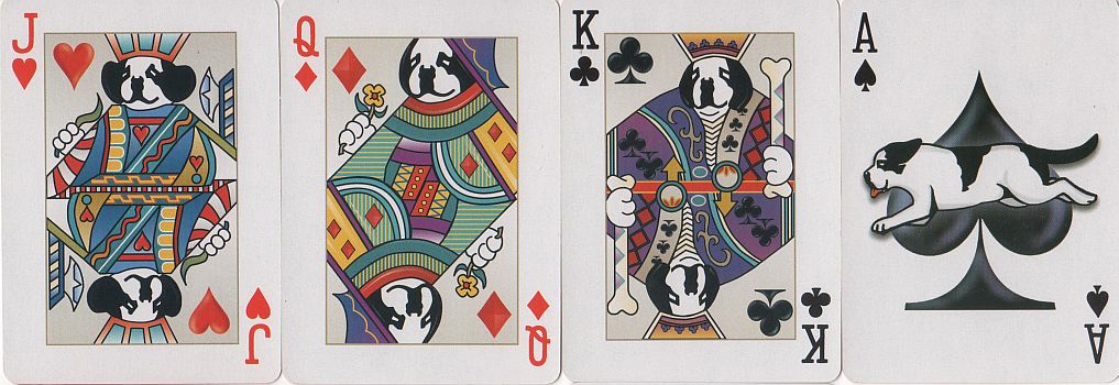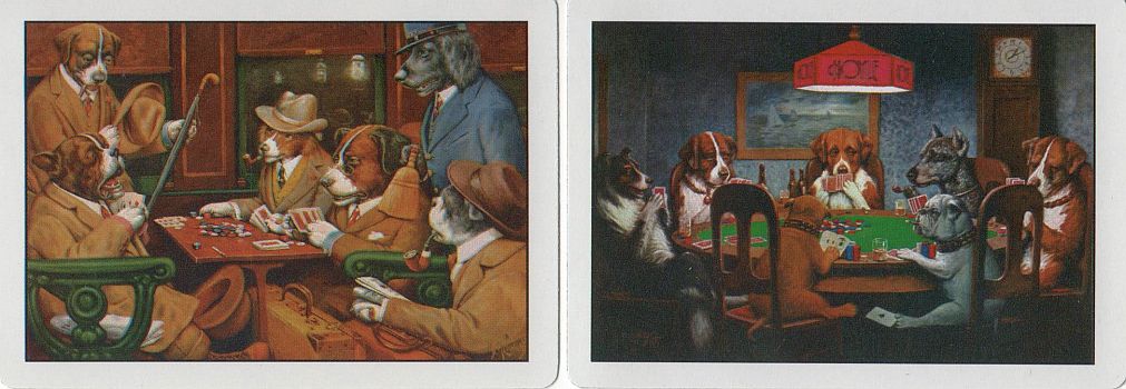 Dogs playing poker. Two decks of cards that came in a tin. Both paintings are by Cassius Marcellus Coolidge. The first one here, "His Station and Four Aces," is the picture used on the lid of the tin. The other one is "A Friend in Need."