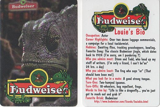 Budweiser lizard. You may remember the lizards from a series of Budweiser commercials. One of them, Louie, wants to be an actor. So there's one card in this deck with his bio, but otherwise the cards are all pretty normal. I will say this: the box the cards came in says "Learn about lizards and internet fun facts inside this deck. Do frogs really taste like chicken?" There are no such facts in the deck, however. Rip-off! (Note, the URL at the bottom of the bio is gone now, but it has been archived).